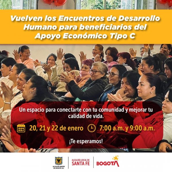 El 20, 21 y 22 de enero en horas de la mañana, el equipo de la Alcaldía Local visitará diferentes barrios de la localidad donde se llevará a cabo las Jornadas de Encuentros de Desarrollo Humano para todos los beneficiarios del apoyo económico ‘subsidio tipo C’, allí se realizará el taller ‘Dejando Huellas’, un espacio de participación para las personas mayores de la comunidad. Estos espacios tiene como objetivo: